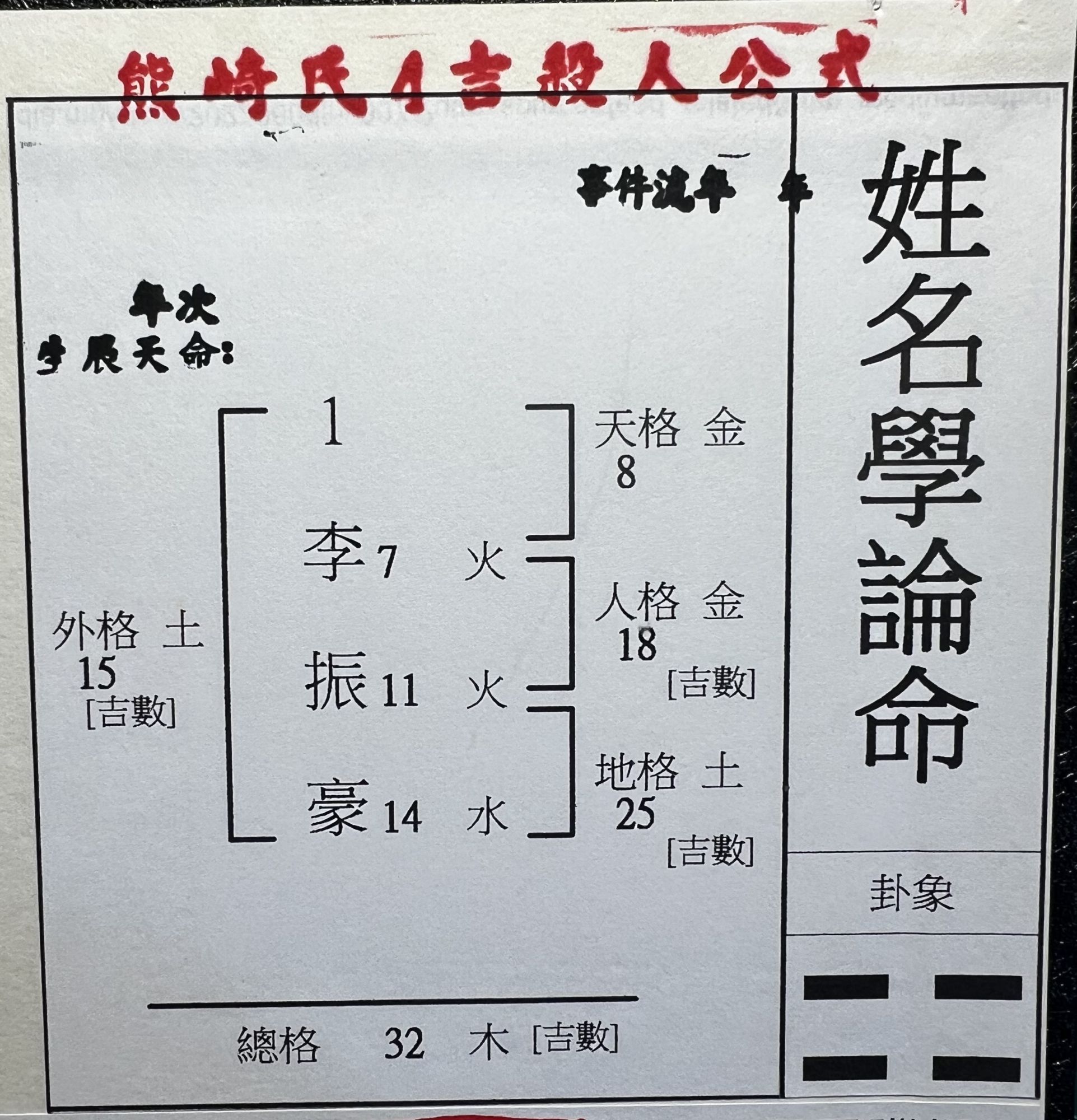 呵呵,讀者們去詳細看看,上面這可惡到極點人蛇集團的九人姓名是否有發現全部都是四吉數的熊崎式格局所命的名,