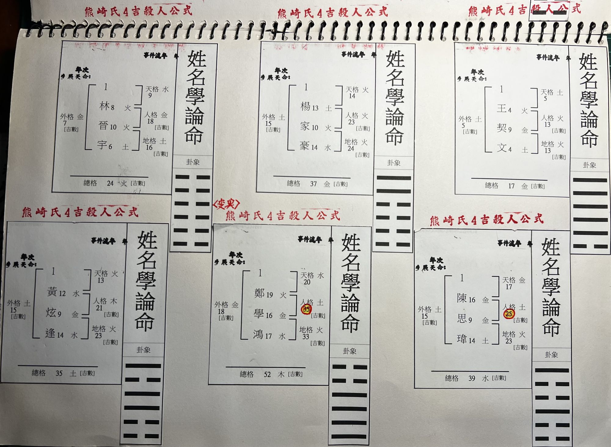 全部都是一出生父母就找尋老師所命的名!!!而上面的九個名字都是同一個老師所命的名嗎???!!!當然不是,是因為現在市面80%的姓名學老師為人命名改名都會應用上面的熊崎式四吉公式,