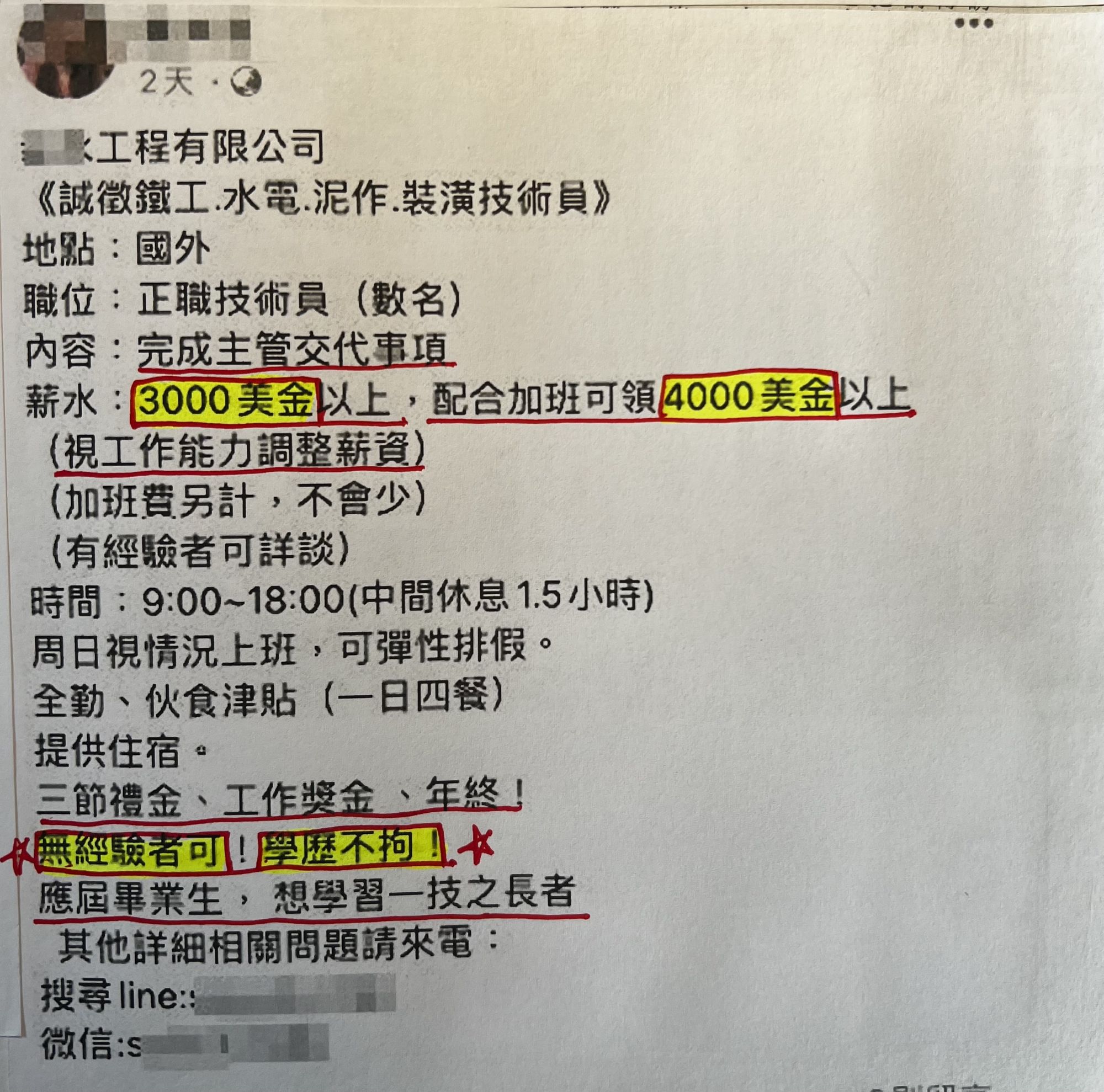 上面這兩則招人廣告一看就知到典型詐騙集團在找[豬仔]廣告,卻仍有成千上萬無知天真的台灣人去應聘,殊不知一步錯就可能與家人朋友永遠的天人永隔!!!
