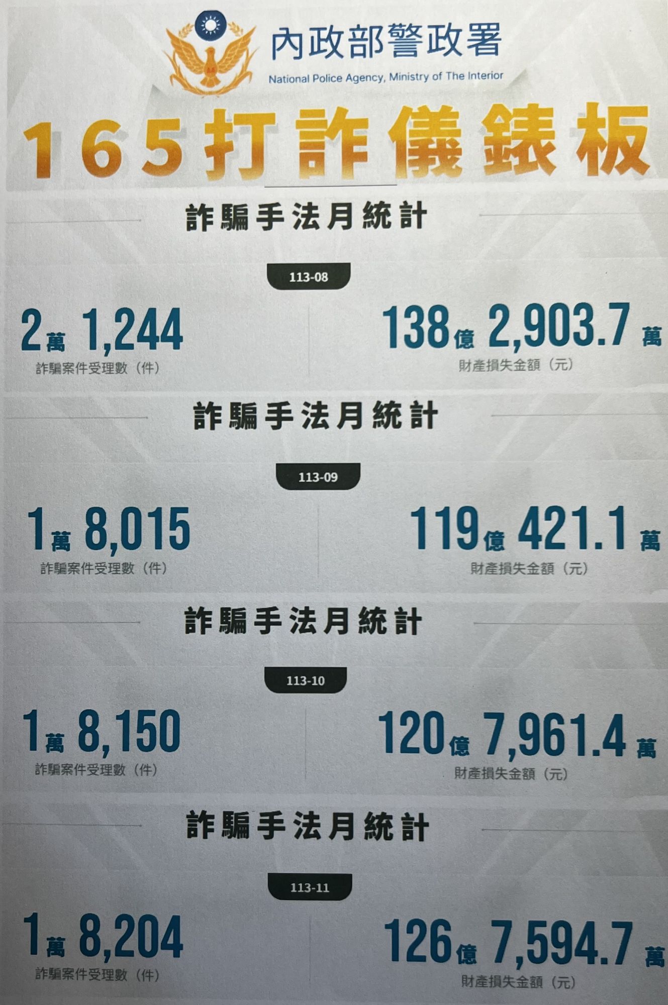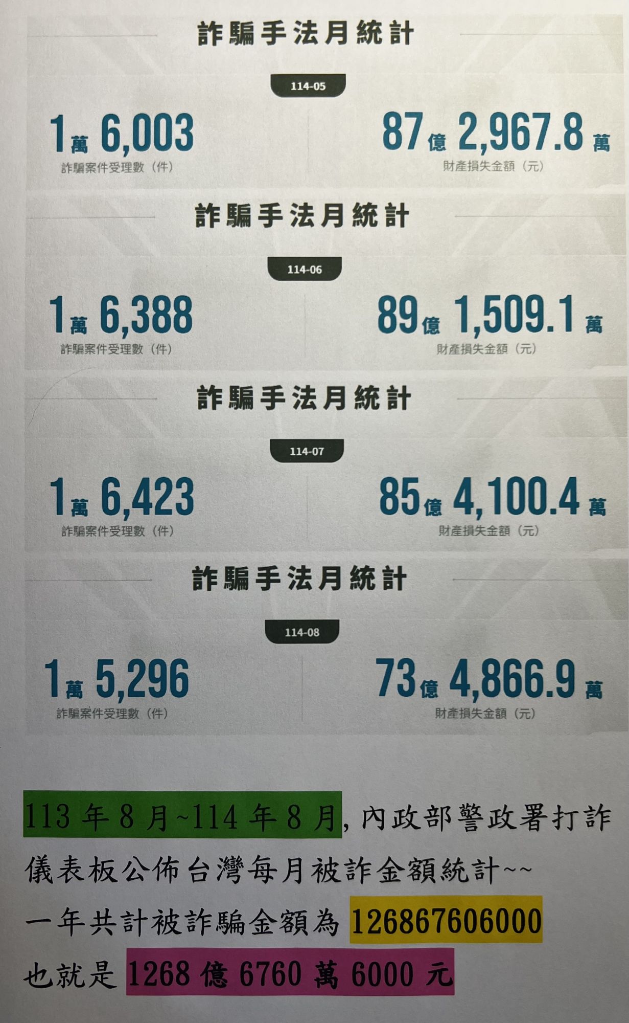 上圖是台灣自113年/8月~114年8月一年中台灣被詐騙集團騙取的金額有報案統計數為1268億6760萬6000元!!!