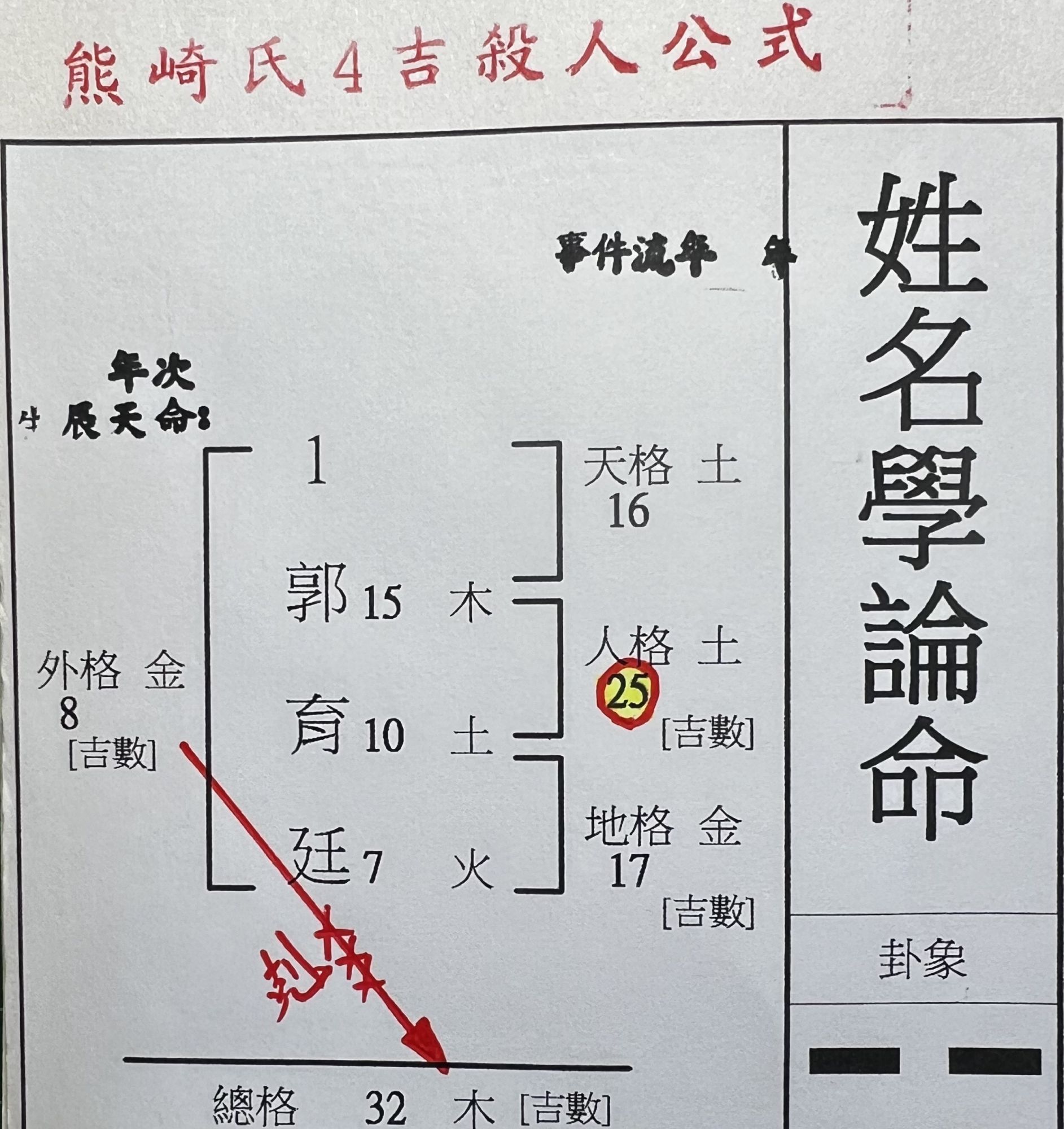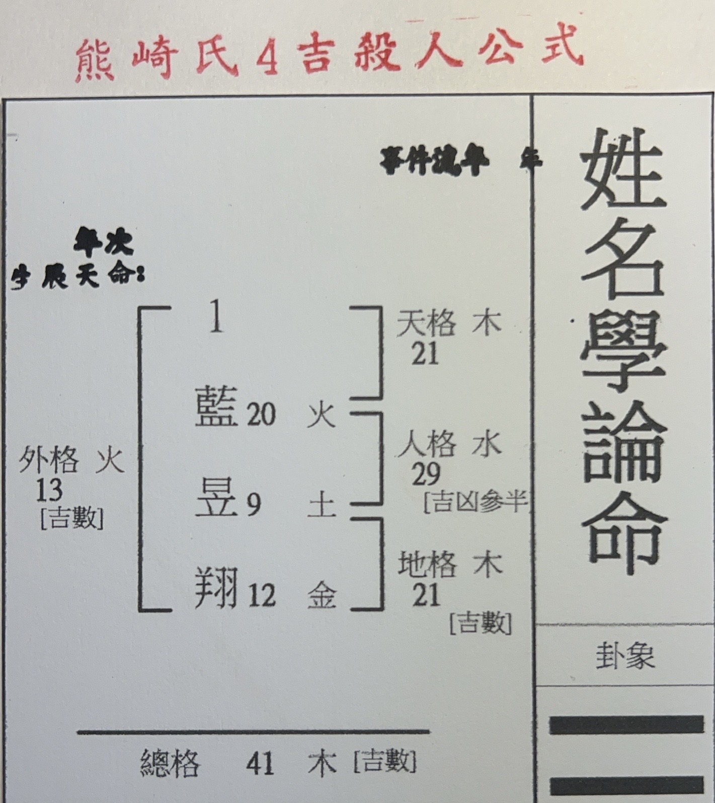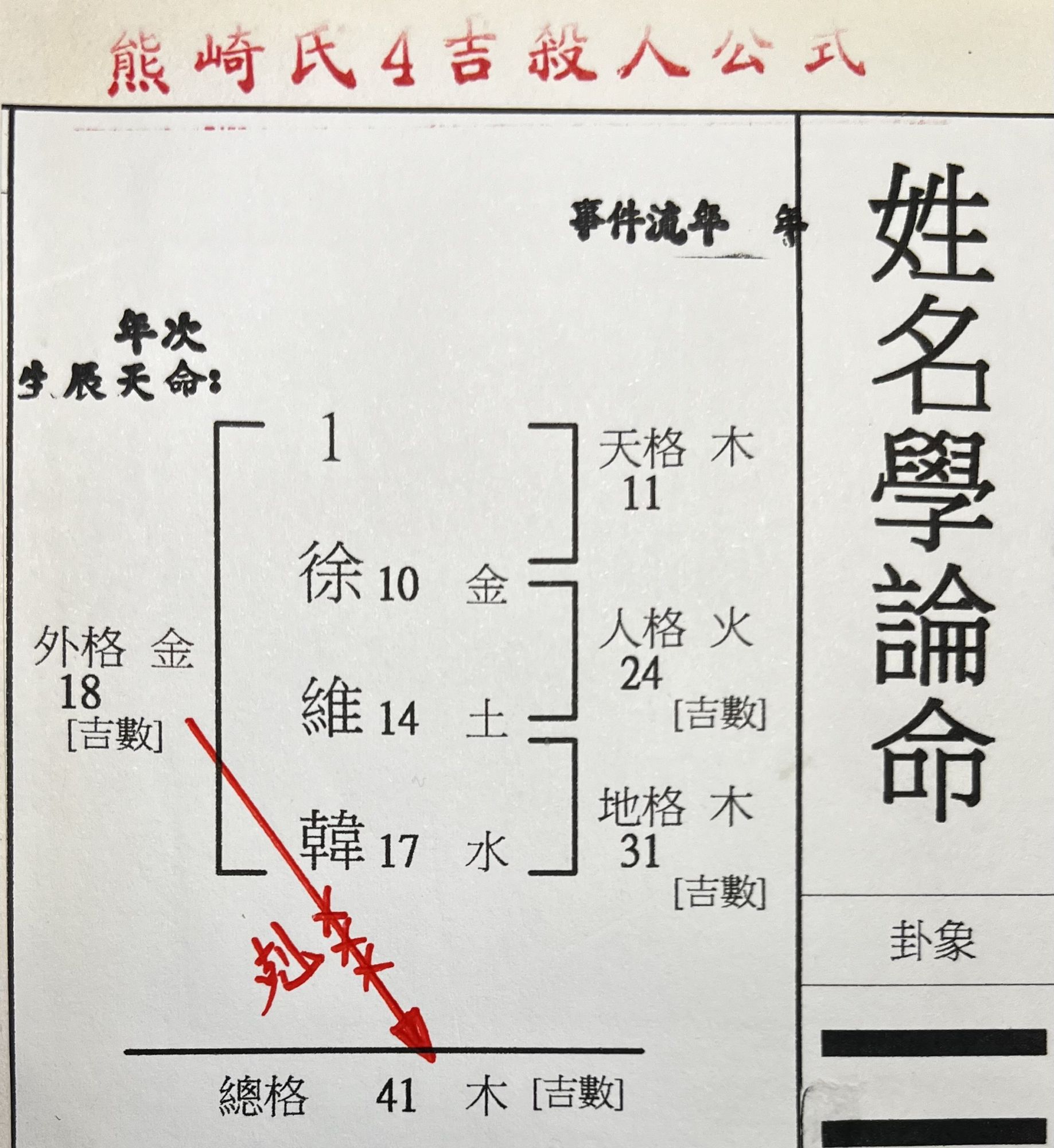 而熊崎式四吉命名公式最大的問題就是為了把姓名四格都排成吉數,根本不考慮陰陽平衡問題所以出現很多全陽格局,也不考慮五行平衡問題所以出現很多類似火旺土焦金熔或者水旺木漂金沉之局......,更沒有天命之說,所以此理論是無法判斷兩個郭台銘為何這位身價幾千億員工數百萬人另位僅是工地的小包公頭,身價甚至還是入不敷出,亦沒有流年判斷參考...........所以說現在的父母為新生子女命名或找老師改名至少要多少了解老師的理論為何???是否有根據,合不合理是否有實證可對應嗎???至少基本的求證是必須要的,才不會糊裡糊塗地