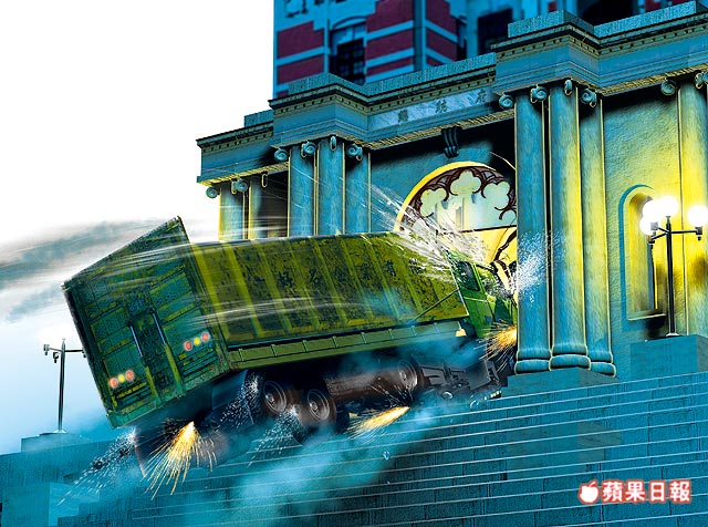等情節遭判刑,認為司法不公,昨晨寫下:「媽,女兒請妳照顧好。」隨即駕駛35噸重砂石車、以逾72公里時速,從凱道朝總統府高速撞擊,維安人員發現後不到5秒鐘,他已突破鐵欄杆、阻車柱、地虎閘、階梯與防彈門共5道關卡,衝進總統府門廊,幸砂石車未爆炸、無人傷亡